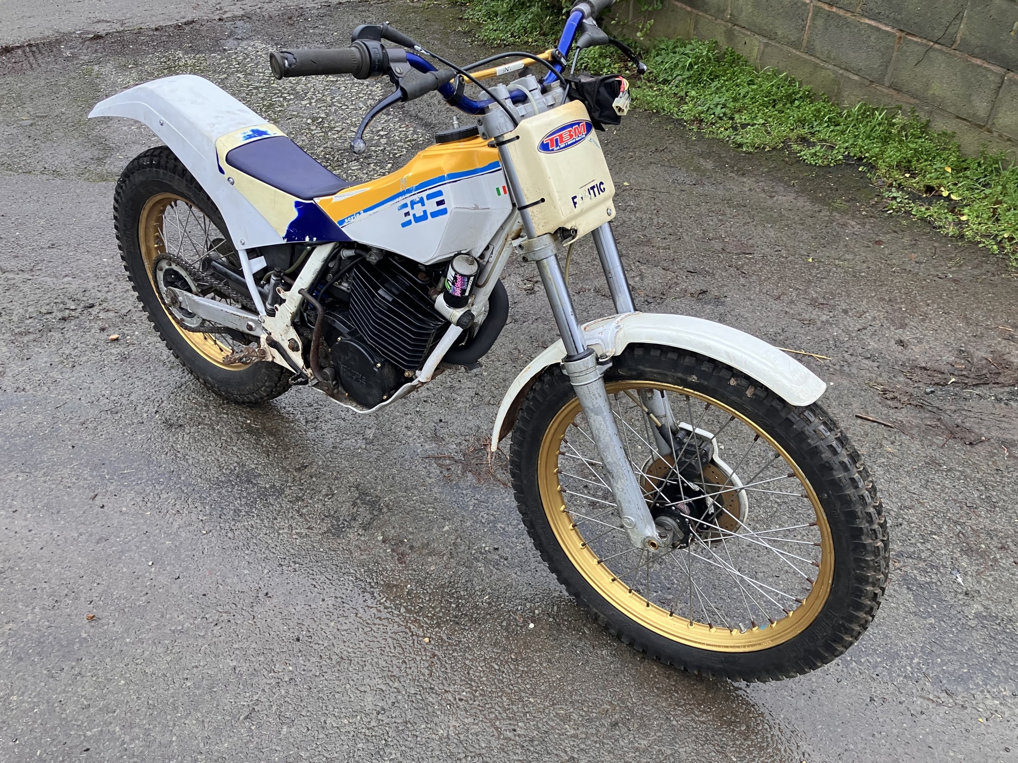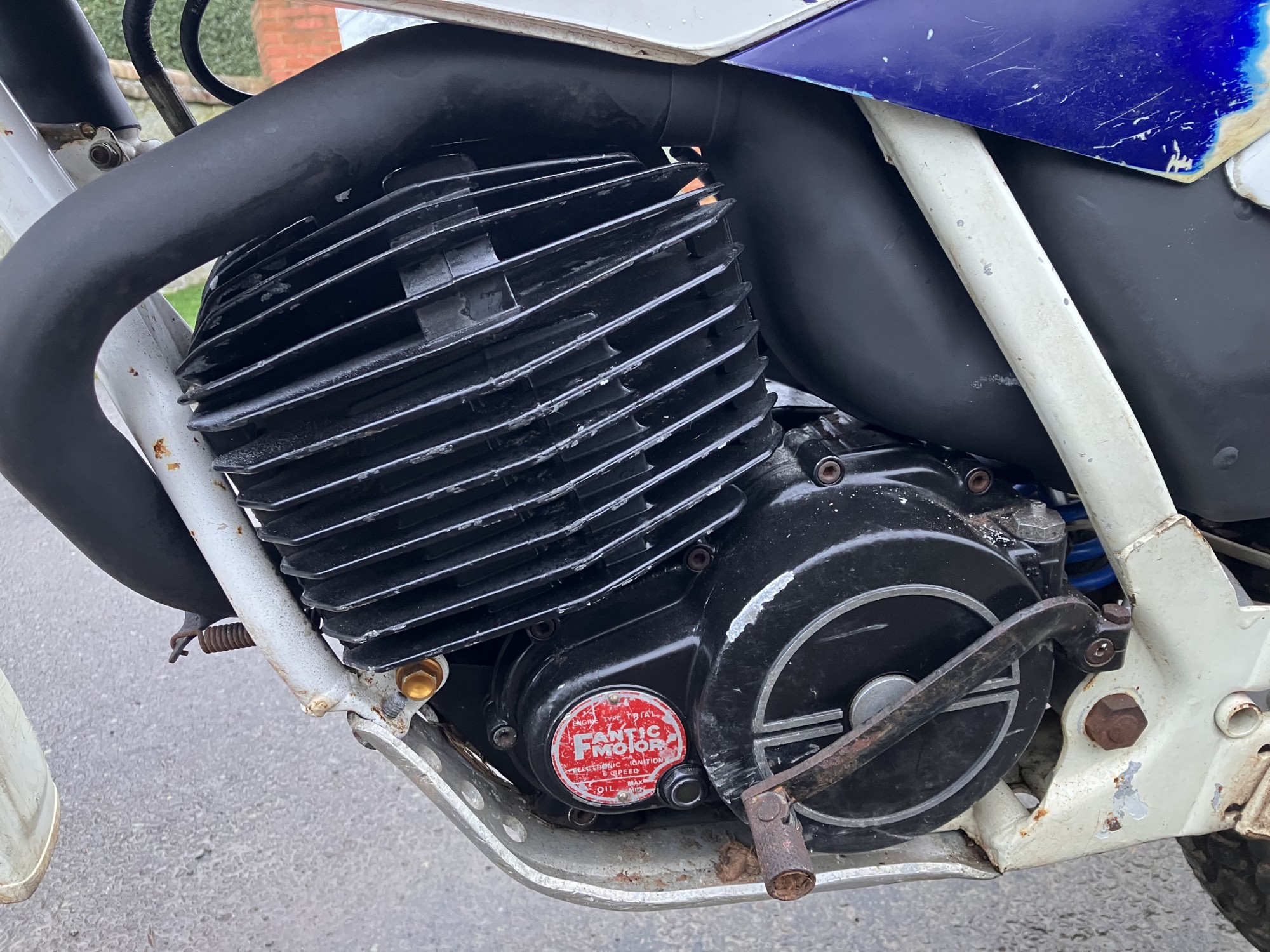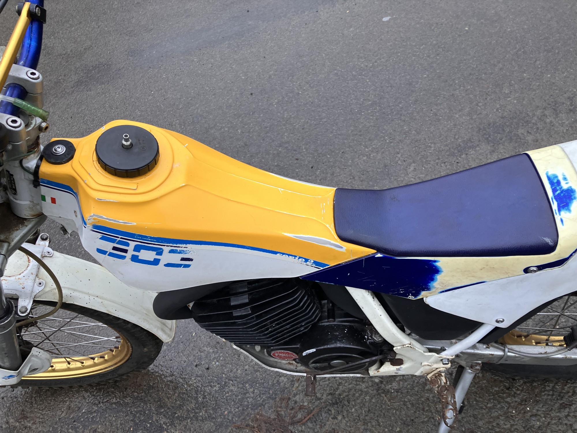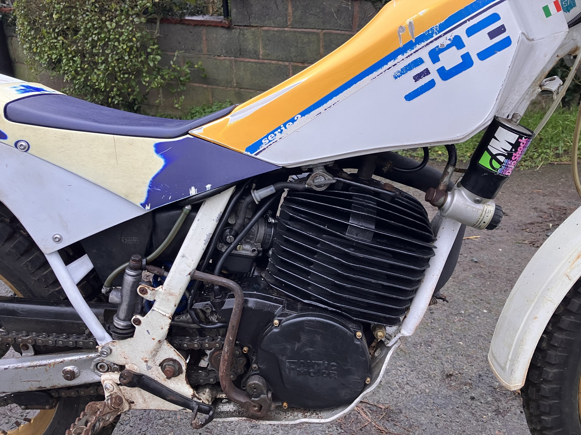 Fantic 303 series 2. Just arrived from long term storage. This machine has been unused for many years but luckily well stored. It has scrutineering marks present on major components so must have been used for major events when new, as all the marks are still there it would indicate it has had little use since.